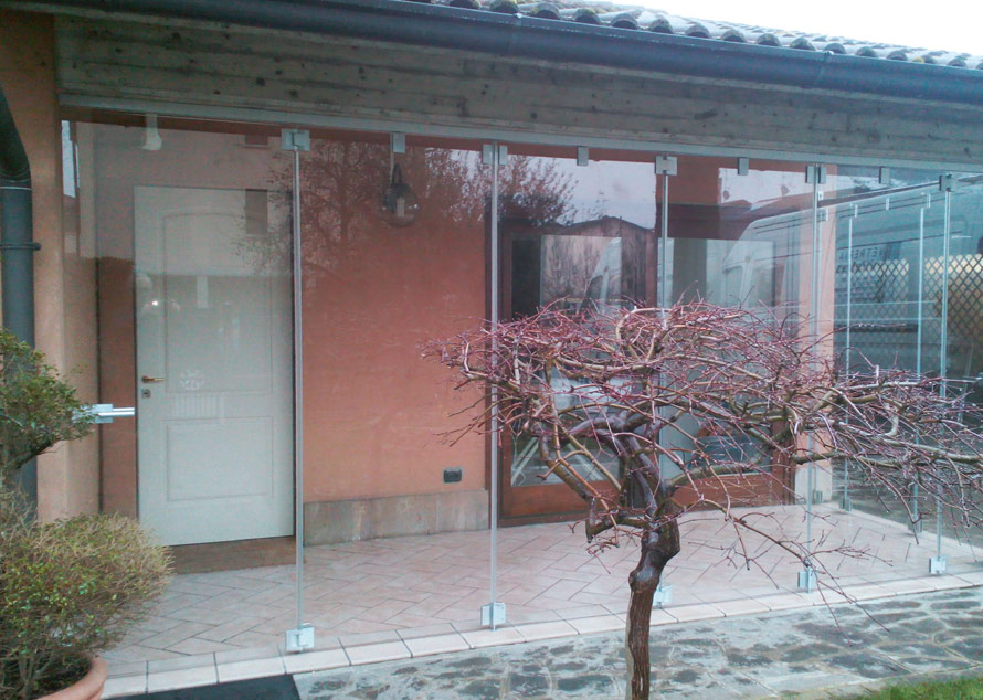 Faltschiebewandsystem mit mittiger Faltung, mit sichtbaren Bändern und Glasbohrungen, komplett mit Laufschiene h=42 mm x L=45 mm und Laufwagen mit 4 Rädern.