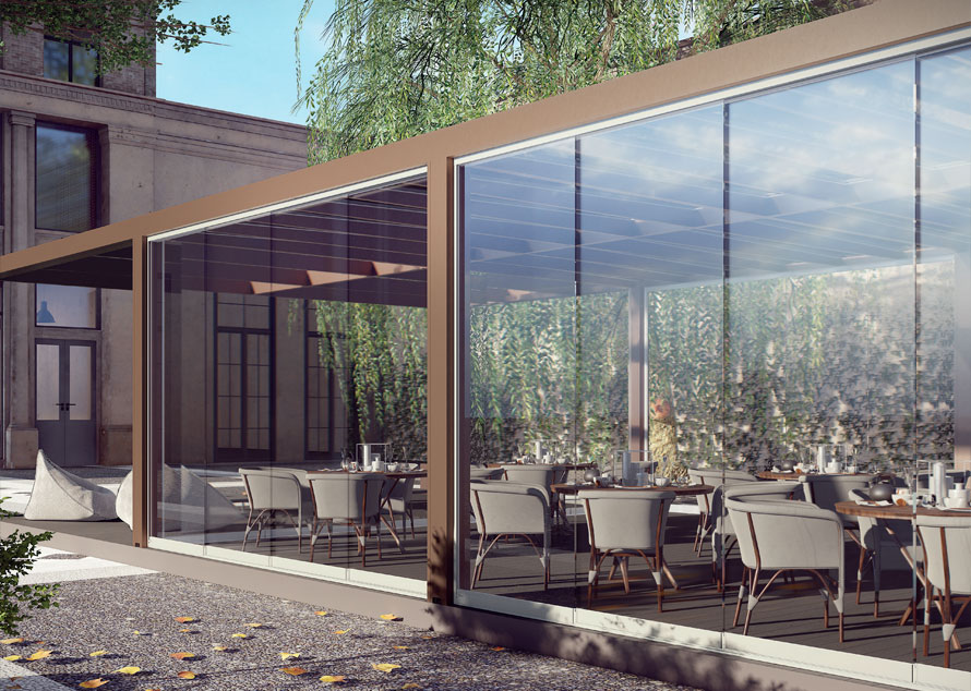 SYSTEM MIT BODENFÜHRUNG: Teleskop Schiebetürsystem für Balkon und Loggiaverglasungen, ideal für Wind-und Wetterschutz.